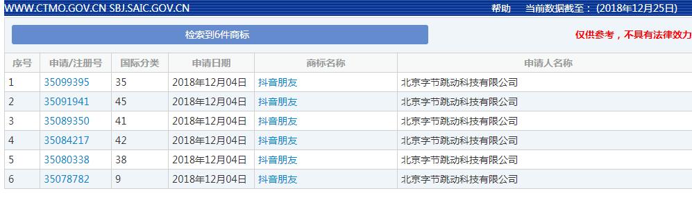 12月27日消息 “今日头条”母公司北京字节跳动科技有限公司于12月4日提交了一份名为“抖音朋友”的商标申请,申请号为35091941,该商标国际分类为社交、法律服务类,目前处于“申请收文”状态。