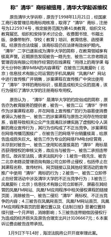 据北京市海淀区人民法院官方微博1月9日消息,原告清华大学诉称,其于1998年已经取得了“清华”商标,经合法续展,该商标现仍在法律有效保护期内。