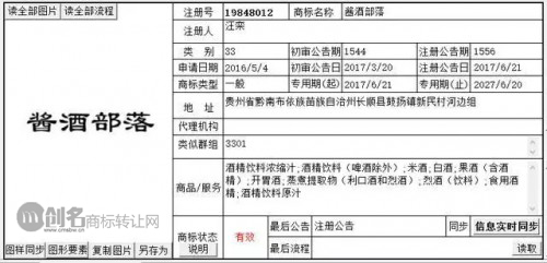 没想到,结果远远超出了他的预期。“酱酒部落”于2016年5月4日提出申请注册在第33类商标上,2017年6月21日被正式核准注册。核准注册还不到3个月,就引起了酒界20多位大佬的关注,纷纷抢购想把该商标收入囊中,甚至已有人出到了1000万的天价。