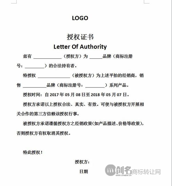 商标授权是指商标注册人通过签订商标使用授权合同授权他人使用其注册的商标,被授权人可以通过授权合同从事经营生产活动,那么商标授权书该如何写?是否有规范的格式?创名商标网会为您作详细的解答: