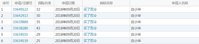 有位名叫“白小华”的申请人,就申请提交了“买了否冷”的商标,目前商标处于“等待实质审查”阶段,是否能成功还不得而知。