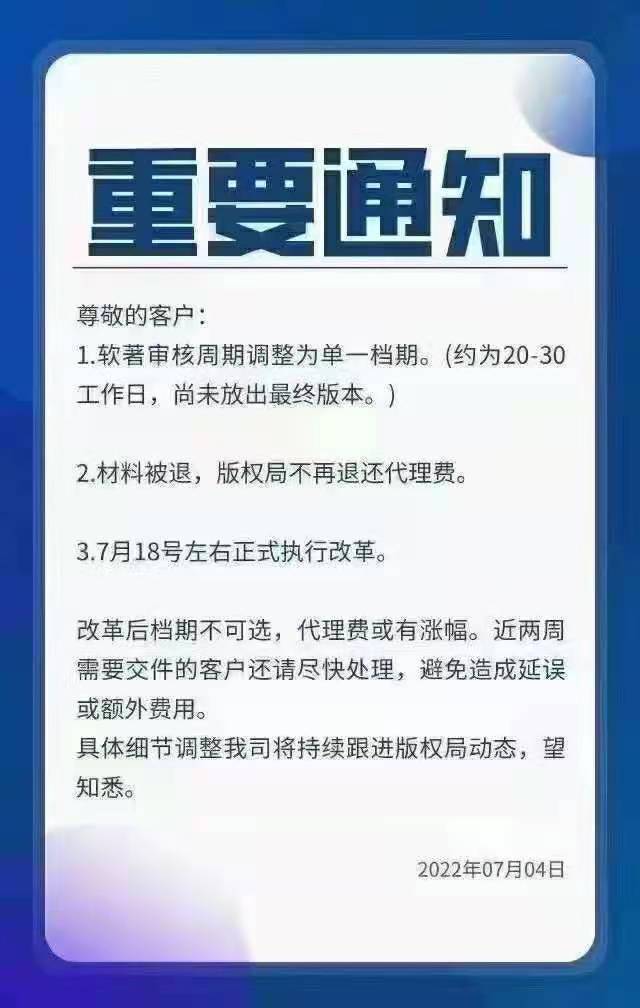 本月15号以后国家版权局会出新规,申请会更严格,出证会更难,时间统一为20-30个工作日,价格会增加,今年计划申请软著的企业请尽快在10号之前递交。