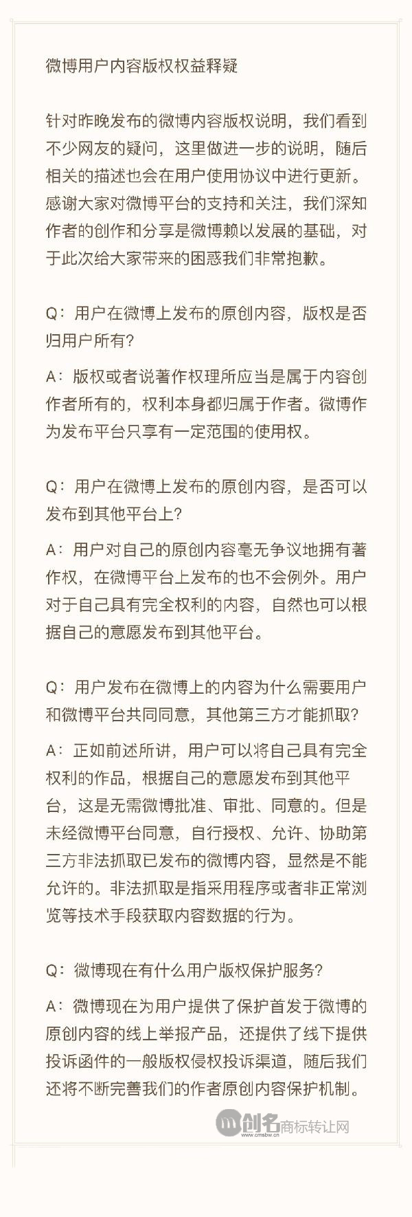 微博连夜发公告修改协议中不恰当的表述,并在10多个小时后再次发公告释疑和道歉,称用户对自己的原创作品毫无争议地拥有著作权,该条款仅针对未经微博平台同意的第三方非法抓取行为。此外,微博也表示,上线了保护首发于微博的原创内容的线上举报产品,将不断完善作者原创内容保护机制。